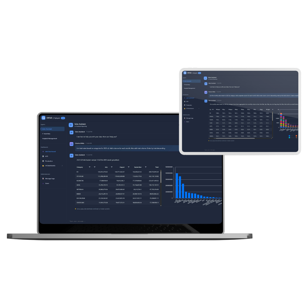 DBTalk, kurumların tüm verilerini hızlı, güvenli ve teknik bilgiye ihtiyaç duymadan analiz edebilmesini sağlayan yapay zekâ destekli bir veri erişim platformudur. Kullanıcılar doğal dilde sorular yönelterek saniyeler içinde kendi raporlarını oluşturabilir. Teknik uzmanlık veya BI uzmanlığı gerektirmeden karmaşık veri setlerini analiz edebilmek, teknik ekiplere olan bağımlılığı önemli ölçüde azaltır ve veri taleplerini tek bir noktadan karşılamak yerine tüm organizasyon geneline yayar.